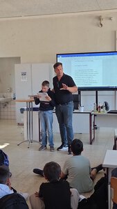 Der spannende Tag begann mit Lesungen für unsere fünften und sechsten Klassen. Mit seiner lebendigen Art, vorzulesen und zu erzählen, gelang es Herrn Pongs schnell, die Kinder in die Welt seiner Bücher mitzunehmen. Im Anschluss folgte eine Schreibwerkstatt für interessierte Schülerinnen und Schüler. Gemeinsam mit dem Autor entwickelten sie eigene Geschichten, indem sie einen vorbereiteten Erzählanfang fortsetzten. Dabei entstanden viele spannende, lustige und originelle Texte, die am Ende stolz vorgetragen und von Herrn Pongs sowie von allen Anwesenden gewürdigt wurden.